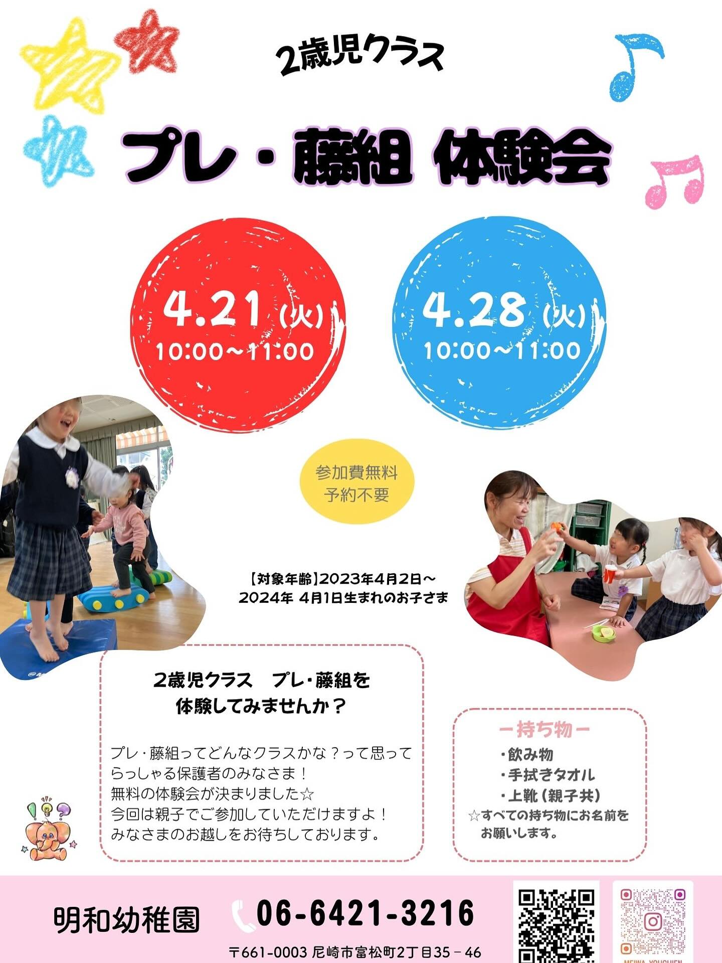 2歳児クラスのプレ・藤組の体験会の日程が決まりました! プレ・藤組ってどんなクラスかな?と思っていら…